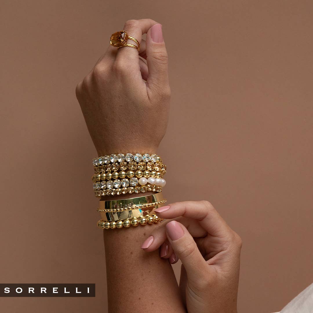 Crystal Zola Stretch Bracelet features a side of repeating metal beads and a side of round cut crystals on a multi-layered stretchy jewelry filament, creating a durable and trendy piece. From Sorrelli's Crystal collection in our Bright Gold-tone finish. (SKU: 4BFJ40BGCRY)