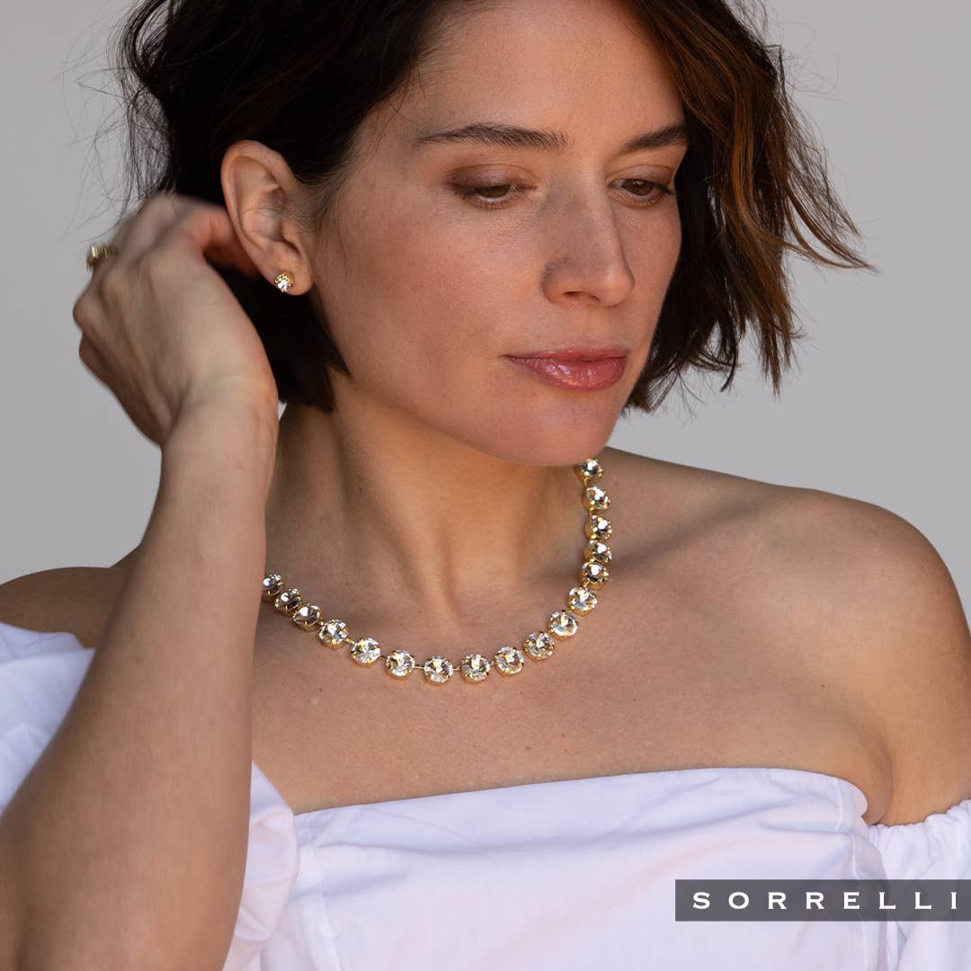 Introducing the Mara Tennis Necklace, a perfect blend of classic elegance and contemporary style! This stunning piece showcases a full line of rivoli cut crystals in a sophisticated brass setting, instantly drawing attention. With a variety of metal finishes and crystal colors available, you can effortlessly find the perfect match for your unique taste. The Mara Tennis Necklace takes inspiration from a timeless silhouette, making it an incredibly versatile accessory that can dress up a casual outfit or add a touch of sparkle to an evening ensemble. This must-have staple for any wardrobe offers endless possibilities for mixing and matching. Whether you're on the hunt for a striking statement piece or a thoughtful gift, the Mara Tennis Necklace is the ultimate choice. Indulge in this fashionable accessory and watch as you light up the room with your radiant glow!. From Sorrelli's Crystal collection in our Bright Gold-tone finish. (SKU: NFD75BGCRY)