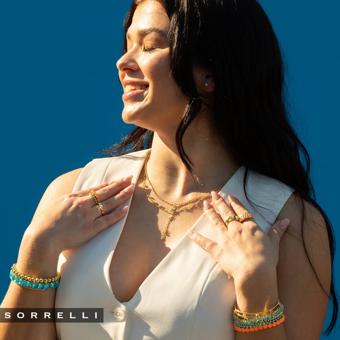 The Mini Single Crystal Stretch Bracelet features repeating metal beads and a single round cut crystal on a multi-layered stretchy jewelry filament, creating a durable and trendy piece. From Sorrelli's Crystal collection in our Bright Gold-tone finish. (SKU: BFN33BGCRY)