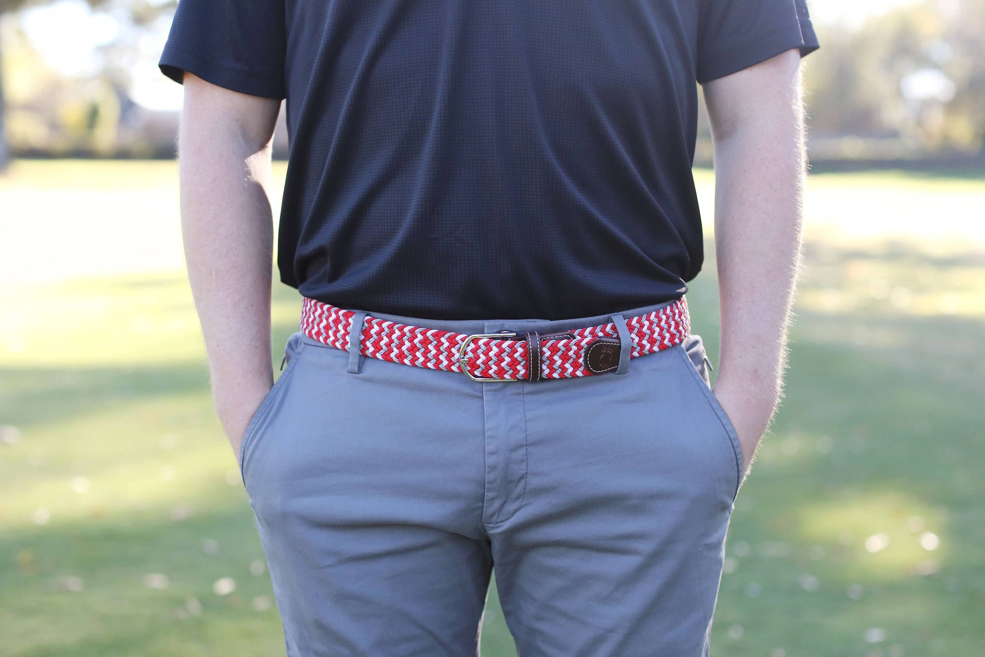 The Dublin multi-color braided stretch belt. Scarlet, Grey, and White Belt with a silver rounded buckle and dark brown leather finish stamped with the Roostas logo. An adjustable clasp goes through the woven belt, allowing for adaptable sizing. Designed for optimal comfort on and off the course.